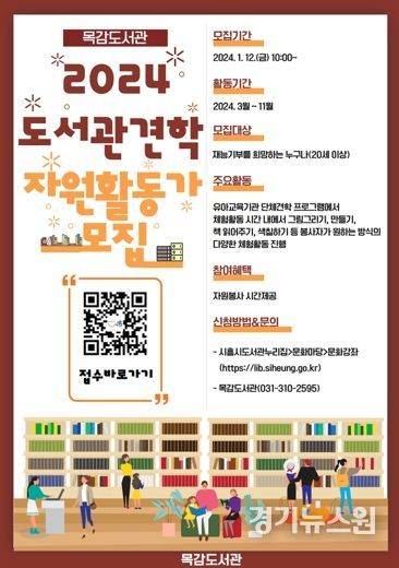 경기뉴스원 | 시흥시 목감도서관은 ‘2024년 견학프로그램을 함께 운영할 자원활동가’를 모집한다.