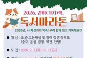 [경기뉴스원/경기뉴스1] | 충청북도교육청 직속기관 중원교육문화원은 언제나 책봄 정책을 활성화 하기 위해 2월 3일부터 3월 13일까지 북부권 초‧중‧고등학생과 학부모를 대상으로 '2026년 같이(가치)책 독서마라톤' 참여자를 모집한다. 중원교육문화원은 3월 말 발대식을 시작으로 오는 12월까지 독서마라톤을 본격 운영할 계획이다. '2026년 같이(가치)책 독서마라톤'은 학생들이 매월 읽기와 기록, 성찰 활동을 반복하며 꾸준한 독서 습관을 기를 수 있도록 운영되는 프로그램이다. 참가자들은 다채움 플랫폼 ‘채움책방’을 활용해 시간과 장소에 관계없이 독서 활동에 참여할 수 있으며, 누적 독서량에 따라 12월에 구간별 완주증서와 기념품을 받게 된다. 참여 기준은 매월 1편 이상, 총 8회의 독후감상문을 업로드하는 것으로, 학년별 독후감상문 서식과 글자 수 기준에 따라 독서 권수가 인정된다. 독서 완주구간은 ▲소크라테스(8~16권) ▲플라톤(17~34권) ▲아리스토텔레스(35권 이상)으로 구분된다. 참여를 희망하는 학생은 중원교육문화원 누리집에서 신청할 수 있으며, 기타 문의 사항