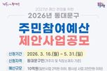 [경기뉴스원/경기뉴스1] | 서울 동대문구는 2027년 예산편성을 위한 2026년도 ‘주민참여예산사업 아이디어 공모’를 5월 31일까지 진행한다. ‘주민참여예산제도’는 예산 편성 과정의 주민참여 기회를 보장하고 재정운영의 건전성 및 투명성을 확보하기 위한 제도이다. 총 10억 원 규모로 진행되는 2026년 동대문구 주민참여예산사업은 주민의 편의 및 복리 증진을 위한 생활밀착형 사업을 대상으로 한다. 동대문구에 거주하거나 근무하는 주민 누구나 동대문구 누리집, 주민e참여 누리집 또는 구청·주민센터 방문이나 우편으로 신청할 수 있다. 단, 이미 추진 중인 사업이나 특정인·단체를 위한 사업 등은 제외된다. 구는 기존 1억 원에서 2억 원으로 일반사업비 한도를 확대해 제안사업의 수용 범위를 넓혔다. 이를 통해 더욱 다양한 주민 제안사업 발굴이 가능해지고 사업의 실효성도 높아질 것으로 기대된다. 또한 예산학교 운영방식을 개선해 이론 교육과 사업제안서 작성 실습을 병행함으로써 주민들이 직접 사업을 제안할 수 있는 참여 역량을 강화할 계획이다. 이필형 동대문구청장은 “주민들의 다양한 의견이 구정에