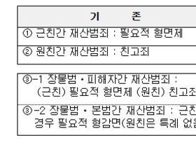 이번 「형법」 개정안에 따르면, ① 친족의 범위를 불문하고 친족간 재산 범죄는 친고죄로 일치시켜 규정하고, ② 장물범과 본범(예:절도범 등) 사이가 근친인 경우 현행 ‘필요적 감면’에서 ‘임의적 감면’으로 개정하며, ③ 근친・ 원친 여부를 불문하고 친고죄로 개정됨에 따라 「형사소송법」 및 「군사법원법」상 고소 제한 규정의 특례를 마련하여 자기・배우자의 직계존속에 대하여도 고소를 할 수
