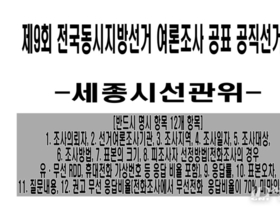 세종시선관위는 공직선거법 안내 공문을 통해 오는 2026년 6월 3일 실시되는 제9회 전국동시지방선거와 관련해 선거여론조사 결과를 공표·보도할 경우 법에서 정한 필수 정보를 반드시 함께 명시해야 한다고 밝혔다. 공직선거법 제108조 제6항에 따르면 누구든지 선거에 관한 여론조사 결과를 공표하거나 보도할 때에는 「선거여론조사기준」에서 정한 사항을 함께 공개해야 한다. 이를 위반할 경우 3천만 원 이하의 과태료가 부과된다. ◇ 최초 공표 시 12개 항목 의무 기재 여론조사 결과를 최초로 공표·보도할 경우 다음 12개 항목을 반드시 포함해야 한다. 조사의뢰자, 선거여론조사기관, 조사지역, 조사일자, 조사대상, 조사방법, 표본의 크기, 피조사자 선정방법(전화조사의 경우 유·무선 RDD, 휴대전화 가상번호 등 응답비율 포함), 응답률, 표본오차, 질문내용, 권고 무선 응답비율(전화조사에서 무선전화 응답비율이 70% 미만인 경우) 특히 전화조사의 경우 유선·무선 비율을 명확히 밝혀야 하며, 무선전화 응답비율이 70%에 미달할 경우에는 권고 무선 응답비율도 함께 명시해야 한다. ◇ 인용 보도 시에도 주요 정보 필요 이미 공표된 여론조사 결과를 인용해 보도하는 경우에도 일