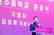 [경기뉴스원/경기뉴스1] | 의왕시 백운밸리 지역에 신설된 백운호수중학교의 준공식이 24일 백운호수중학교 체육관에서 개최됐다. 의왕백운프로젝트금융투자(주)(의왕백운PFV(주)) 주최로 열린 이날 준공식에는 김성제 의왕시장, 임태희 경기도 교육감, 김학기 의왕시의회 의장과 도·시의원, 의왕백운피에프브이(주) 김양묵 대표이사, 의왕백운밸리에이엠시(주) 이성훈 대표이사 등 주요 내빈과 지역주민 400여 명이 참석해 자리를 빛냈다. 이번 준공식은 학교 설립을 위해 힘써 온 관계자와 지역 주민들이 한 자리에 모여 그동안의 결실을 함께 나누고 축하하는 뜻깊은 행사로 마련됐다. 의왕시 백운밸리 일대는 주거단지 조성과 함께 인구가 지속적으로 증가하고 있는 지역으로, 그간 중학교 부재에 따른 학생들의 원거리 통학 문제가 꾸준히 제기돼 왔다. 이에, 시는 ‘중학교 신설’이라는 지역 숙원사업 해결을 위해 다각적인 방안을 검토해 왔으며, 2023년 11월 의왕시·군포의왕교육지원청·의왕백운피에프브이(주) 간 3자 업무협약을 체결함으로써 학교 설립이 본격 추진됐다. 협약을 통해 시에서는 백운호수 초등학교 인접