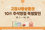 [경기뉴스원/경기뉴스1] | 고창군이 추석을 맞아 군민 생활안정과 지역경제 활성화를 위해 ‘고창사랑상품권 특별할인 행사’를 진행한다. 이번 행사는 10월 한 달간 진행된다. 이번 특별할인은 △상품권 구매시 10% 선할인 △고창사랑카드 결제시 10% 캐시백 적립을 통해 최대 20% 혜택을 받을 수 있도록 구성됐다. 특히, 월 구매한도를 100만 원까지 확대해 군민들의 혜택을 더욱 강화했다. 예를 들어, 10만원 상품권 구매 시 10%(1만 원) 선할인을 적용받아 9만원에 구매하고, 이후 고창사랑카드로 결제하면 결제금액의 10%가 캐시백으로 적립돼 실질적으로 최대 20% 혜택을 누릴 수 있다. 다만, 선할인(10%)이 적용된 금액은 캐시백 적립 대상에서 제외된다. 심덕섭 고창군수는 “이번 추석 명절 특별 할인을 통해 군민들께는 생활비 부담을 덜어드리고, 지역 소상공인들에게는 매출 증대 효과가 기대된다”며 “특히, 군에서 지급하는 군민활력지원금과 정부의 민생소비쿠폰이 더해져 군민 모두가 더욱 넉넉한 추석 명절을 보내시길 바란다”고 밝혔다. 한편, 고창사랑상품권은 전통시장과 지역