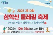 [경기뉴스원/경기뉴스1] | 파주시 교하동 주민자치회는 오는 25일 10시, 심학초등학교에서 ‘2025년 제10회 심학산 둘레길 축제’를 개최한다고 밝혔다. ‘깊어가는 가을 속 심학산으로 초대합니다’를 주제로 열리는 이번 행사는 가족이 함께 걷고 즐기는 가을맞이 지역 축제로, 심학산의 아름다운 둘레길을 배경으로 다양한 프로그램이 진행될 예정이다. 이날 축제는 오전 10시 식전 공연을 시작으로, 11시 개막식이 진행된다. 축제 현장에는 체험공간, 먹거리 장터, 농산물 직거래 장터, 풍자화(캐리커처) 무료 체험(선착순 30명) 등 풍성한 볼거리와 즐길 거리가 마련된다. 또한 경품 추첨과 노래자랑 등 참여형 행사도 진행되며, 75인치 발광다이오드(LED) 텔레비전 등 푸짐한 경품이 준비돼 있다. 특히 올해 축제에는 파주시 홍보대사이자 초대가수 김대훈이 출연해 신나는 무대를 선보일 예정이다. 박용호 교하동 주민자치회장은 “올해로 10회를 맞은 심학산 둘레길 축제는 주민이 주도하는 교하동의 대표 축제로 자리 잡았다”라며 “마을회관에서 행사장까지 차량 지원을 제공하는 등 많은 주민들이 불편 없이 참여할 수 있