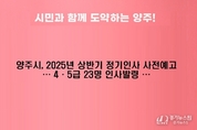 경기뉴스원(경기뉴스1) | 양주시는 26일 2025년 상반기 정기인사에서 4·5급 23명의 인사발령을 사전예고했다. 양주시의 2025년 상반기 정기인사는 행정 효율성을 높이고 조직의 안정적 운영을 위해 필수적인 조치이다. 이번 인사에서는 4급 4명, 5급 19명이 승진 및 전보 인사를 받게 된다. 이번 인사의 임용장 교부식은 2024년 12월 31일(화) 오후 1시 30분에 양주시 대회의실에서 진행될 예정이다. 이번 인사는 승진과 전보를 통해 인재를 적재적소에 배치하고, 직원들의 경력 개발을 지원하는 한편, 행정의 활력을 불어넣는 목적을 가지고 있다. 또한, 조직 내 경험과 역량을 균형 있게 분배하여 양주시의 정책 추진력과 서비스 품질을 더욱 강화할 것으로 기대된다.