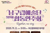 [경기뉴스원/경기뉴스1] | 부산 남구는 오는 11월 2일 오후 17시 부산문화회관 대극장에서‘남구립예술단 합동 연주회 Together, We Sing’을 개최한다. 남구립예술단은 ▲소년소녀합창단(지휘 김주곤) ▲오륙도여성합창단(지휘 곽기웅) ▲욜드합창단(지휘 고영호)으로 구성되어 있으며, 남구를 대표하는 문화사절단으로 활발히 활동하고 있다. 이번 연주회는 남구청 개청 50주년을 기념하여 세 합창단이 처음으로 함께하는 합동 연주회라는 점에서 특별한 의미를 지닌다, 각 합창단의 개성과 감성을 담은 다채로운 무대를 통해 관객에게 풍성한 음악적 경험을 선사할 것으로 기대된다. 소년소녀합창단은 맑고 순수한 목소리로 음악극‘푸른 하늘 은하수’를 선보이고, 오륙도여성합창단은 ‘그리움 그리고 사랑’이라는 테마로 세대를 이어주는 따뜻한 감성의 하모니를 들려주며, 욜드합창단은 인생의 깊이와 여운이 느껴지는 ‘행복한 인생’이라는 감동의 무대를 마련했다. 특히 이번 공연의 하이라이트는 세 합창단이 함께 꾸미는 합동무대다. 서로 다른 세대의 목소리가 한 무대에서 하나의 선율로 어우러지며, 노래를 통해 마음을 나누고 세