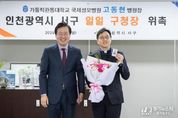 [경기뉴스원/경기뉴스1] | 인천 서구가 지난 19일 가톨릭관동대학교 국제성모병원 고동현 의료원장 겸 병원장을 ‘일일 구청장’으로 위촉했다. 이번 일일 구청장 위촉은 지역 대표 의료기관과의 소통과 협력으로 주민 건강 증진과 지역 발전을 위해 마련됐다. 고동현 병원장은 이날 서구청사를 방문해 강범석 서구청장으로부터 일일 구청장 위촉장을 받고 간부 공무원과의 티타임을 시작으로 ‘일일 구청장’으로서 다양한 일정을 소화했다. 고동현 병원장은 첫 공식 일정으로 2026년 적십자 특별회비 전달식에 참여해 강범석 서구청장과 함께 적십자 특별회비 200만 원을 대한적십자사에 전달했다. 이어 청사 내 주요 행정 현장을 둘러보며 행정 운영을 직접 살폈다. 민원실을 방문해 여권 교부 업무를 직접 체험했으며, CCTV 통합관제센터와 악취·미세먼지 통합관제센터를 방문해 운영 현황을 청취하고 근무 중인 직원들을 격려하기도 했다. 마지막으로 고 병원장은 서구보건소를 방문해 보건소장으로부터 보건소 운영 현황을 듣고 보건소 주요 시설을 둘러봤다. 고동현 병원장은 “평소 쉽게 접하기 어려운 구