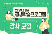 [경기뉴스원/경기뉴스1] | 인천광역시교육청중앙도서관은 지역 주민에게 다양한 학습 기회를 제공하기 위해 ‘2026년 평생학습프로그램’ 강사를 공개 모집한다. 2026년 정규 평생학습프로그램은 상반기(3~5월)와 하반기(9~11월)로 나뉘어 각각 8회씩 운영되며, 모집 분야는 유아 대상 독후활동, 초등 1~2학년 대상 초등 영어, 성인 대상 AI 활용과 동영상 제작, 우쿨렐레, 금융·경제 등 총 5개 분야다. 서류 접수는 12월 23일부터 29일 오후 5시까지이며, 중앙도서관 누리집 공지사항에서 제출 서식을 내려받아 작성한 뒤 관련 서류와 함께 이메일로 제출하면 된다. 강사는 1차 서류심사와 2차 면접심사를 거쳐 최종 선정된다. 자세한 사항은 중앙도서관 누리집에서 확인할 수 있으며, 문의는 마을교육지원과로 하면 된다.