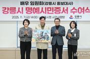 [경기뉴스원/경기뉴스1] | 강릉시는 7일 강릉시 홍보대사인 배우 임원희에게 강릉시 명예시민증서를 수여한다. 임원희 배우는 지난 2020년 10월부터 강릉시 홍보대사로 활동하며, 다양한 대중매체를 통해 강릉을 알리는 데 큰 역할을 해왔다. 특히, 강릉시 공식 유튜브 홍보영상 출연, 강릉커피축제 대표 프로그램 ‘100人 100味’ 및 강원도민체육대회 성화봉송 제1주자 참여 등을 통해 지역 이미지 제고 및 문화관광 홍보에 기여했다. 또한, 방송과 영화를 통해 강릉의 여행 명소와 맛집 및 로컬 문화를 소개하는 등 강릉의 일상적 풍경을 대중문화 속에 알리고, 각종 예능과 인터뷰와 같은 다양한 매체에서 강릉에 대한 애정을 꾸준히 전하며 강릉의 품격과 매력을 전국에 확산시키는 데 앞장섰다. 김홍규 강릉시장은 “오랜 기간 강릉을 사랑하는 마음으로 시 홍보대사로 활동해주신 임원희 배우님께 깊은 감사드린다.”며, “앞으로도 강릉의 이름을 더욱 빛내주시길 바란다.”고 말했다. 한편, 강릉시는 시정발전에 기여한 공로가 현저한 외국인·재외동포 및 타 지역 출신 인사에게 강릉시 명예시민증서를 수여하고 있으며,