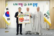 [경기뉴스원/경기뉴스1] | 중랑구가 지난 6 일 오후 구청장실에서 사단법인 나누며하나되기와 함께 ‘ 취약계층 행복나눔 물품 전달식 ’ 을 진행했다 . 이번 전달식에서 대한불교천태종 산하 사단법인 나누며하나되기는 겨울철 추위와 경제적 어려움을 겪고 있는 지역 내 취약계층과 어린이들을 위해 5,000만 원 상당의 건강·생활·방역용품을 기탁했다. 기탁된 성품은 도움이 필요한 가정에 순차적으로 전달될 예정이다. 사단법인 나누며하나되기는 2003년 창립 이후 국내외에서 다양한 구호 활동을 이어오고 있으며, 중랑구와는 이번이 세 번째 나눔이다. 현재까지 중랑구에 전달한 성품의 누적 가액은 약 1억 원에 이른다. 류경기 중랑구청장은 “지역사회를 위해 꾸준히 따뜻한 나눔을 실천해 주셔서 감사드린다”라며 “기탁받은 성품은 도움이 필요한 이웃들에게 정성껏 전달해 모두가 온기를 느낄 수 있는 겨울이 되도록 하겠다”라고 말했다.