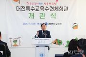 [경기뉴스원/경기뉴스1] | 대전특수교육원은 11월 5일, 유성구 성북동에서 설동호 교육감, 대전광역시의회 교육위원, 교육계 인사 등 70여 명이 참석한 가운데 ‘대전특수교육수련체험관 개관식’을 실시했다고 밝혔다. 대전특수교육수련체험관(이하 수련체험관)은 대전특수교육원 부설기관으로 장애학생의 자립능력과 미래 역량을 키우기 위해 (구)진잠초 방성분교를 수선하여 개관했다. 시설은 교육실, 행동중재지원실, 보조공학실, 일상생활실 등 6실로 구성됐고, 야외에 야영장, 오솔길, 아이글라이더(VR체험) 등 수련활동, 야영 체험을 위한 공간을 마련했다. 개관식은 홍보영상 시청에 이어 내빈 소개, 환영사, 교육감 축사, 교육위원회 위원장 격려사, 경과 보고에 이어 기념식수, 테이프 커팅 후 시설을 함께 둘러보는 탐방의 순서로 진행됐다, 수련체험관 개관을 통해 대전특수교육은‘교육공동체와의 행복한 동행’을 위한 기틀을 마련하게 됐다. 이를 통해 장애학생과 일반학생이 함께 할 수 있는 장애공감 프로그램, 장애학생 수련·체험 프로그램 등을 운영하고, 한국산림복지진흥원, 국립대전숲체원 등 지역사회 관계기관과의 협력을 통해 장애학생