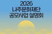 [경기뉴스원/경기뉴스1] | 나주문화재단이 2026년도에 추진할 문화사업 전반을 시민과 공유하고 공모 참여 기회를 확대하기 위해 설명회를 개최한다. 나주문화재단은 오는 2월 24일 나빌레라문화센터 소극장에서 ‘2026년 나주문화재단 통합 공모사업설명회’를 연다고 13일 밝혔다. 이번 설명회는 지역민과 예술인을 대상으로 재단의 연중 사업을 종합적으로 안내하고 공모사업 참여를 독려하기 위해 마련했다. 재단은 2026년 추진 예정 사업 전반과 함께 총 5건의 공모사업 개요, 신청 방법, 서식 작성 요령 등을 상세히 설명할 계획이다. 설명 대상 사업은 나주형 커뮤니티 발굴사업 ‘취향살롱’, 지역문화 활성화 지원사업, 나빌레라문화센터 전시공간 지원 공모, 나빌레라문화센터 창작실 입주작가 공모, 미디어 콘텐츠 촬영 장소 지원 등 5건이다. 설명회에서는 사업 안내와 더불어 현장 질의응답 시간을 운영해 시민과 예술인의 이해도를 높이고 다양한 의견을 수렴할 예정이다. 이를 통해 재단과 지역 문화 주체 간 소통을 강화하고 정책 반영의 기반을 마련한다는 방침이다. 특히 직장인 등