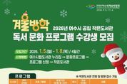 [경기뉴스원/경기뉴스1] | 여수시가 운영하는 5개 공립 작은도서관에서 오는 2026년 1월 5일부터 8일까지 ‘겨울방학 독서문화 프로그램’ 수강생 106명을 선착순 모집한다. 이번 프로그램은 방학을 맞아 학생과 성인을 대상으로 독서를 통해 창의력·사고력을 증진하기 위한 다양한 독서문화 프로그램으로 마련됐다. 운영 기간은 오는 2026년 1월 12일부터 2월 24일까지며 프로그램별 기간이 다르다. 운영 작은도서관은 ▲여문늘벗(구 중부보건지소) ▲꿈을키우는(미평 선경 3차 아파트) ▲화양열린(화양면민회관 2층) ▲청솔글누리(돌산 청솔 2차 아파트) ▲국동(국동 임시별관 1층) 등 5곳이다. 운영 프로그램은 ▲여문늘벗 ‘독서와 보드게임으로 즐기는 세계사(1.16.~2.20.)’ ▲꿈을키우는 ‘하루 한 줄, 그림책 필사(1.12.~1.16.)’, ‘그림책 속 색깔 마법(1.19.~1.23.)’ ▲화양열린 ‘마음보석이 빛나는 그림책 이야기’(1.14.~1.30.), ‘책톡! 영상톡! 나만의 책을 영상으로 표현하기(1.13.~1.29.)’ ▲청솔글누리 ‘책이 들려주는 그림소리(1.13.~2.24.)’, ‘책과 함께 실타