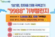 [경기뉴스원/경기뉴스1] | 광주광역시 서구가 오는 20일부터 11월 6일까지 18일간, 치매 인식 개선과 기부문화 확산을 위한 ‘1보1원, 한마음 치매극복걷기 9988 기부챌린지’를 진행한다. 이번 챌린지는 치매상담콜센터 홍보와 함께 주민 참여를 통해 치매 극복에 대한 지역사회의 관심을 높이기 위해 기획됐다. 치매상담콜센터는 연중무휴로 전문상담사가 맞춤형 상담을 제공하는 서비스로 ‘18세 기억을 99세까지, 99세까지 팔팔(88)하게’라는 의미를 담고 있다. 참가자는 ‘워크온(Walk On)’ 앱을 활용해 하루 평균 9988보를 달성할 경우 ‘1만원 기부권’을 받을 수 있으며 챌린지 종료 후 만족도 조사와 기부 동의 절차를 완료하면 기부권이 서구 관내 취약계층 치매환자 가구에 전달된다. 서구는 총 300명의 챌린지 달성자를 목표로 하며 누적 기부금 300만 원은 치매환자 30가구에 각 10만 원씩 전달할 예정이다. ‘9988 챌린지’ 참여가 어려운 주민은 하루 동안 1만보를 걷고 1만 원을 기부하는 ‘1보1원 순수기부’에 참여할 수 있다. 김이강 서구청장은 “치매는 개인의