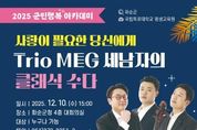 [경기뉴스원/경기뉴스1] | 화순군은 '2025 군민행복 아카데미의 마지막 10회차 강연을 오는 12월 10일 오후 3시에 화순군청 4층 대회의실에서 개최한다고 밝혔다. 이번 강연은 클래식 연주단체 Trio MEG를 초청해 ‘사랑이 필요한 당신에게 – Trio MEG 세 남자의 클래식 수다’를 주제로 진행된다. 피아노(김용진)·바이올린(오현)·첼로(윤여훈)의 실내악 연주와 해설을 곁들인 클래식 토크 콘서트 형식으로, 누구나 공감할 수 있는 ‘사랑’을 테마로 재해석한 명곡을 군민들에게 들려줄 예정이다. Trio MEG는 2017년 창단한 클래식 전문 연주단체로 ‘Music makes Everything Grow(음악은 모든 것을 성장시킨다)’를 슬로건으로 활동하고 있다. 50여 곡의 명곡을 재창작해 발표했으며, 전국 문화재단 · 교육기관 · 지자체 · 기업 등에서 활발한 공연 활동을 이어오고 있다. 또한 KBS 클래식FM, TBS 교통방송, 한경ARTE TV 등에도 다수 출연했다. 조미화 화순군 인구청년정책과장은 “2025년 한 해 동안 군민행복 아카데미에 함께해 주신 군민