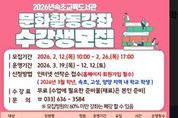 [경기뉴스원/경기뉴스1] | 속초교육도서관은 관내 학생 및 학부모·지역주민들의 지속 가능한 배움을 통한 자기성장을 위해 ‘2026년 문화활동강좌’ 수강생을 모집한다. 이번 강좌는 3월 19일부터 12월 12일까지 운영되며, 초등학생 대상 △어린이 글로 표현하는 세상 등 7개 강좌, 중·고등학생 대상 △핵심을 잡아주는 고등논술 등 2개 강좌, 학부모·지역주민 대상 △포토샵 자격증반 등 5개 강좌로 총 14개 프로그램이 운영된다. 수강 신청은 2월 12일부터 2월 26일까지 속초교육도서관 누리집을 통해 신청 가능하며, 스마트폰 활용교육 강좌는 방문을 통해 선착순으로 신청할 수 있다. 김주희 관장은 “지역주민 누구나 학습을 통해 배우고 성장할 수 있도록 평생교육의 기회를 지속적으로 확대·지원할 것이다.”라고 전했다. 자세한 내용은 속초교육도서관 누리집 공지사항을 참고 하거나 담당자에게 문의하면 된다.