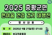 [경기뉴스원/경기뉴스1] | ‘2025 증평군민 한마음 건강걷기대행진’이 오는 27일 오전 7시, 증평 보강천 운동장에서 열린다. 증평군체육회(회장 최재옥)가 주관하는 이번 행사는 군민의 건강 증진과 화합 도모, 가족 중심의 여가 문화 확산을 위해 마련됐다. 걷기 코스는 보강천 운동장을 출발해 천변공원, 김득신 다리, 무궁화길을 거치는 약 3.5km 구간이다. 경사가 완만하고 자연경관이 뛰어나 남녀노소 누구나 부담 없이 참여할 수 있는 코스로 구성됐다. 사전 신청 없이 군민 누구나 자유롭게 참여할 수 있으며, 참가자 전원에게 기념품이 제공되고 다양한 경품 추첨도 함께 마련된다. 체육회는 이번 걷기 대행진을 통해 군민이 함께 어우러지는 건강한 공동체 분위기를 조성하고, 삶의 질 향상에도 기여할 것으로 기대하고 있다. 최재옥 회장은 “보강천변의 아름다운 경관을 따라 가족, 친구들과 함께 걸으며 건강도 챙기고 즐거운 추억도 만드는 시간이 되길 바란다”며 “많은 군민들의 참여를 부탁드린다”고 말했다.