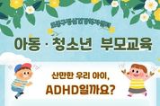 [경기뉴스원/경기뉴스1] | 서울 도봉구가 오는 3월 26일 오후 7시 30분에 아동·청소년기 대표 정신질환인 주의력결핍 과잉행동장애(ADHD)에 대한 부모 교육을 실시한다. 교육은 온라인(ZOOM)으로 진행되며, ▲주의력 결핍 및 과잉 행동장애의 증상 ▲평가 과정과 조기 발견 ▲증상 관리 및 치료 방법 ▲주의력 결핍 및 과잉 행동 장애 자녀 양육을 위한 노하우 등에 대해 다룬다. 강의는 신혜경 정신건강의학과 전문의가 맡는다. 교육 신청은 3월 26일 오후 7시 30분까지 도봉구 정신건강복지센터 누리집에서 가능하다. 자세한 내용은 지역보건과 정신건강복지센터로 문의하면 된다.