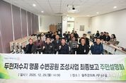 [경기뉴스원/경기뉴스1] | 울주군 청량읍 문죽리 일원에 추진되는 두현저수지 명품수변공원 조성사업 실시설계용역 결과에 대한 주민설명회가 29일 울주군의회 의사당 1층 세미나실에서 열렸다. 이날 설명회는 이상걸 경제건설위원장의 요청에 따라 사업의 구체적인 실행 계획을 실제 이용 주체인 주민들에게 공유하고자 마련됐으며, 최길영 의장, 울주군 산림공원과 및 용역사 관계자, 저수지 인근 마을 주민 등 20여명이 참석한 가운데 진행됐다. 두현저수지 명품수변공원 조성사업은 량읍 문죽리 1222번지 일원 장기 미집행 도시계획시설인 두현공원(18만1,708㎡)에 군비 150억 원을 투입해 추진된다. 사업은 2027년 상반기 준공을 목표로 수변 산책로와 연결교량, 조망데크, 마을숲정원, 주차장 등을 조성할 계획이다. 설명회에 참석한 주민들은 용역사로부터 실시설계용역 결과를 청취한 뒤 인근 마을과의 접근성 향상 방안, 수질 개선을 위한 분수대 설치, 주차장 추가 확충 등 다양한 의견과 건의사항을 제시했다. 이상걸 경제건설위원장은 “두현저수지 수변공원은 단순한 공원 조성을 넘어 주민들에게 쾌적한 휴식 공간을 제공하고