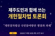 [경기뉴스원/경기뉴스1] | 제주특별자치도의회, 제주특별자치도 주민자치위원회협의회, 제주대학교 리걸클리닉센터, 제주미래디자인포럼, 사회적협동조합 제주로 공동 주최로 11월 25일 오전 10시, 제주특별자치도의회 1층 대회의실에서 '제주도민과 함께 쓰는 개헌절차법 토론회'를 개최한다. 국민주권 시대에 국민이 주도하는 헌법 개정 요구가 커지고 있고 이에 시민의회 방안, 국민청원 방안, 추진협의회 방안 등 국민참여방안을 담은 개헌절차법안이 3건이 국회에 발의됐지만 3건 법안의 국민참여방안은 제주도민의 의견을 충분히 반영하기에는 미흡하다는 지적이 있음에따라 이번 토론회는 제주도민의 목소리가 실질적으로 담길 수 있는 개헌절차법 제정 방안을 깊이 있게 모색하기 위해 마련됐다. 토론회는 이상봉 제주특별자치도의회 의장의 인사말로 시작하여 이남근 제주특별자치도의회 의원이 좌장을 맡고 신용인 제주대학교 로스쿨 교수가 '개헌절차법상 국민참여 방안 쟁점과 과제'를 주제로 발표할 예정이다. 또한 고정학 제주특별자치도주민자치위원회협의회장, 신훈민 변호사, 양광수 아라동 주민자치위원장, 조현주 국민주도상생개헌행동 상임공동대표가 제주도민의