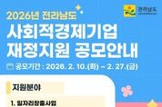 [경기뉴스원/경기뉴스1] | 전라남도는 오는 27일까지 사회적경제기업의 지속적이고 안정적인 성장과 자립을 지원하기 위한 2026년 사회적경제기업 재정지원사업 공모를 추진한다. 이번 공모는 ▲일자리창출 지원 ▲사업개발비 지원 ▲시설장비 지원 ▲시군 지역 특화사업 지원, 4개 분야로 나눠 530여 기업에 총 49억 원을 지원할 예정이다. 지난해(27억 원)보다 대폭 확대된 규모다. 특히 올해는 기업 선호도가 높은 인건비에 국비 지원이 재개되고, 도 자체 지원도 확대해 기업의 고용 부담을 완화하고 안정적 일자리 창출을 적극 지원할 방침이다. 일자리창출사업은 진입 초기 사회적기업을 대상으로 취약계층 고용 1명당 월 50만~90만 원을 최대 3년간 인건비로 지원하며, 도 자체 지원사업인 전남형 일자리창출사업은 일반인력과 전문인력까지 추가로 지원한다. 사업개발비 사업은 사회적경제기업의 제품 품질개선, 디자인과 시제품 제작, 홍보비 등 최대 1억 원을 지원한다. 시설장비 사업은 기업이 신규 시설장비를 구입하거나 노후 시설장비 교체 시 최대 2천만 원을 지원한다. 이외에도 시