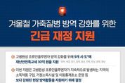 [경기뉴스원/경기뉴스1] | 겨울철 가축질병 방역 강화를 위한 긴급 재정 지원 - 고병원성 조류인플루엔자 방역 강화를 위해 9개 시·도*에 재난안전특교세 30억 원을 지원 *광주, 세종, 경기, 충북, 충남, 전북, 전남, 경북, 경남 - 이번 지원은 고병원성 조류인플루엔자가 지속적으로 발생하는 지역의 소독약품 구입, 거점소독시설 및 이동통제초소 운영 등 보다 강화된 현장 방역활동을 지원하기 위해 결정 - 행안부는 지난해 11월 24일에 14개 시·도에 고병원성 조류인플루엔자 확산 방지를 위한 재난안전특교세 50억 원을 지원했으며 이번까지 포함하면 총 80억 원을 지원