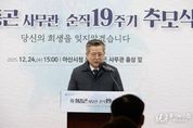[경기뉴스원/경기뉴스1] | 아산시는 24일, 아산시청 앞 故 최종곤 사무관 흉상 앞에서 ‘故 최종곤 사무관 순직 19주기 추모식’을 거행했다. 이번 추모식은 2006년 12월, 공무 수행 중 불의의 사고로 순직한 故 최종곤 사무관의 숭고한 희생과 헌신을 기리고, 시민의 안전을 위해 헌신한 공직자의 사명과 책임을 되새기기 위해 마련됐다. 이날 행사에는 유가족을 비롯해 김범수 아산시 부시장, 맹의석 아산시의회 부의장, 동료 공직자 등 다수가 참석해 고인을 추모했다. 김범수 부시장은 추모사에서 “故 최종곤 사무관은 시민의 안전을 자신의 책무로 여기며 현장에서 묵묵히 소임을 다한 참된 공직자였다”며 “고인의 희생과 헌신은 오늘의 아산시 공직자들에게도 큰 울림과 책임으로 남아 있다.”고 말했다. 이어 “아산시는 고인의 뜻을 잊지 않고, 시민의 안전을 최우선으로 하는 행정을 이어 가겠다”고 밝혔다. 故 최종곤 사무관은 2006년 12월 24일, 송악면 국도 39호선에서 조류인플루엔자 확산 방지 업무를 수행하던 중 과속 차량에 의해 사고를 당해 순직했다. 고인은 생전 성실한 근무와 투철한 책임감으로 동료와 시