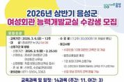 [경기뉴스원/경기뉴스1] | 음성군은 2026년 상반기 여성회관 능력개발교실 수강생을 모집한다. 이번 교육은 오는 3월 6일부터 12주간 진행되며 △재봉틀반 △라인댄스 △라떼아트 △바리스타자격증반 △떡 만들기 △헤어커트 △프랑스 자수 △민화 등 주·야간 총 14강좌로 구성돼 있다. 접수는 2월 9일부터 25일까지 선착순으로 이뤄지며, 음성군민 여성·남성 누구나 신청할 수 있다. 수강 희망자는 접수 기간 내 신분증을 지참하고 음성군 여성회관(2층)을 방문해 신청하면 된다. 수강료는 12주 기준 3만원으로 수강 신청 시 현금 납부이며 재료비는 개인 부담이다. 군 관계자는 “유익한 학습 경험을 통해 군민들의 삶의 질을 높일 수 있도록 최선을 다하겠다”며 “군민들의 수요를 반영한 특별 강좌에 많은 군민이 관심을 두고 참여하길 기대한다”고 말했다.