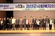 [경기뉴스원/경기뉴스1] | 충북 괴산군은 29일 괴산군 문화예술회관에서 ‘제13회 괴산군 사회복지의 날 기념행사’를 개최했다고 밝혔다. 이번 행사는 괴산군사회복지협의회(회장 고명성) 주관으로 열렸으며, 송인헌 괴산군수를 비롯한 사회복지시설 종사자 등 200여 명이 참석한 가운데 사회복지인의 노고를 격려하고 화합을 다지는 자리로 마련됐다. 행사는 장연지역아동센터 합창단의 식전공연을 시작으로, 괴산군사회복지협의회 회장 이·취임식, 유공자 표창, 인사말, 퍼포먼스 순으로 진행됐다. 이날 이·취임식에서는 최은묵 전 회장에 이어 고명성 신임 회장이 취임했으며, 유공자 표창 수여식에서는 지역 사회복지 증진에 기여한 12명이 표창을 받았다. △군수 표창은 배기만(괴산지역자활센터), 이정자(성제노의집), 심서경(괴산재가복지센터), 이충정(괴산군노인복지관), 안미경(청천재활원), 천병주(수달지역아동센터), 이봉우(햇살재가복지센터), 이정민(괴산군 가족행복과) 등 8명이 수상했다. △군의장 표창은 신미경(괴산지역자활센터), 이만형(청천재활원) 등 2명, △괴산군사회복지협의회장 표창은 조경옥(청주사랑나눔